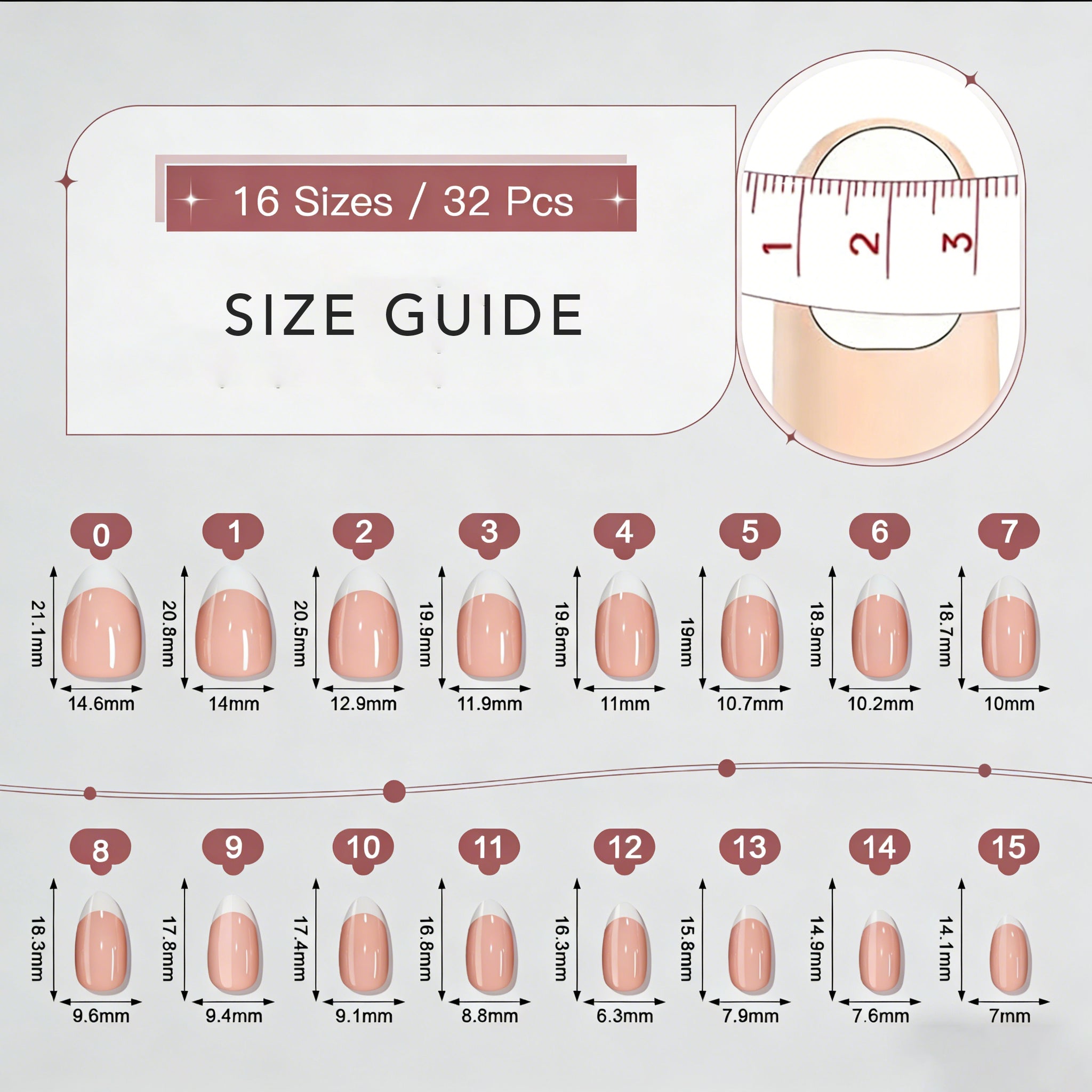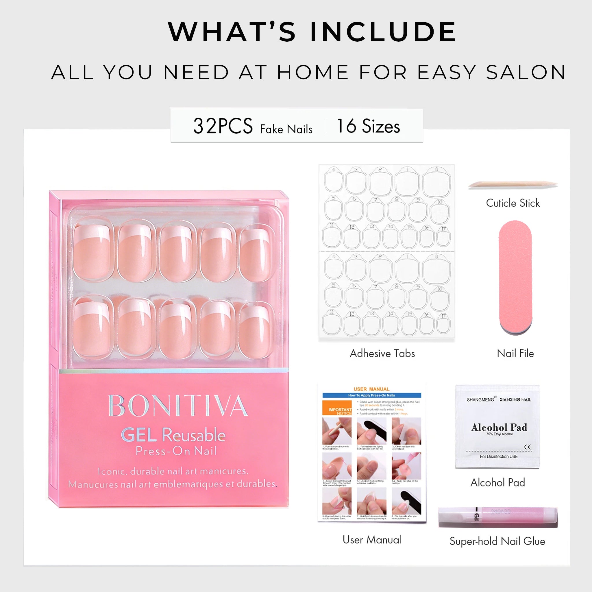 With 32 nails in 16 sizes, you’ll always find your perfect fit and achieve flawless nails in just 5 minutes.