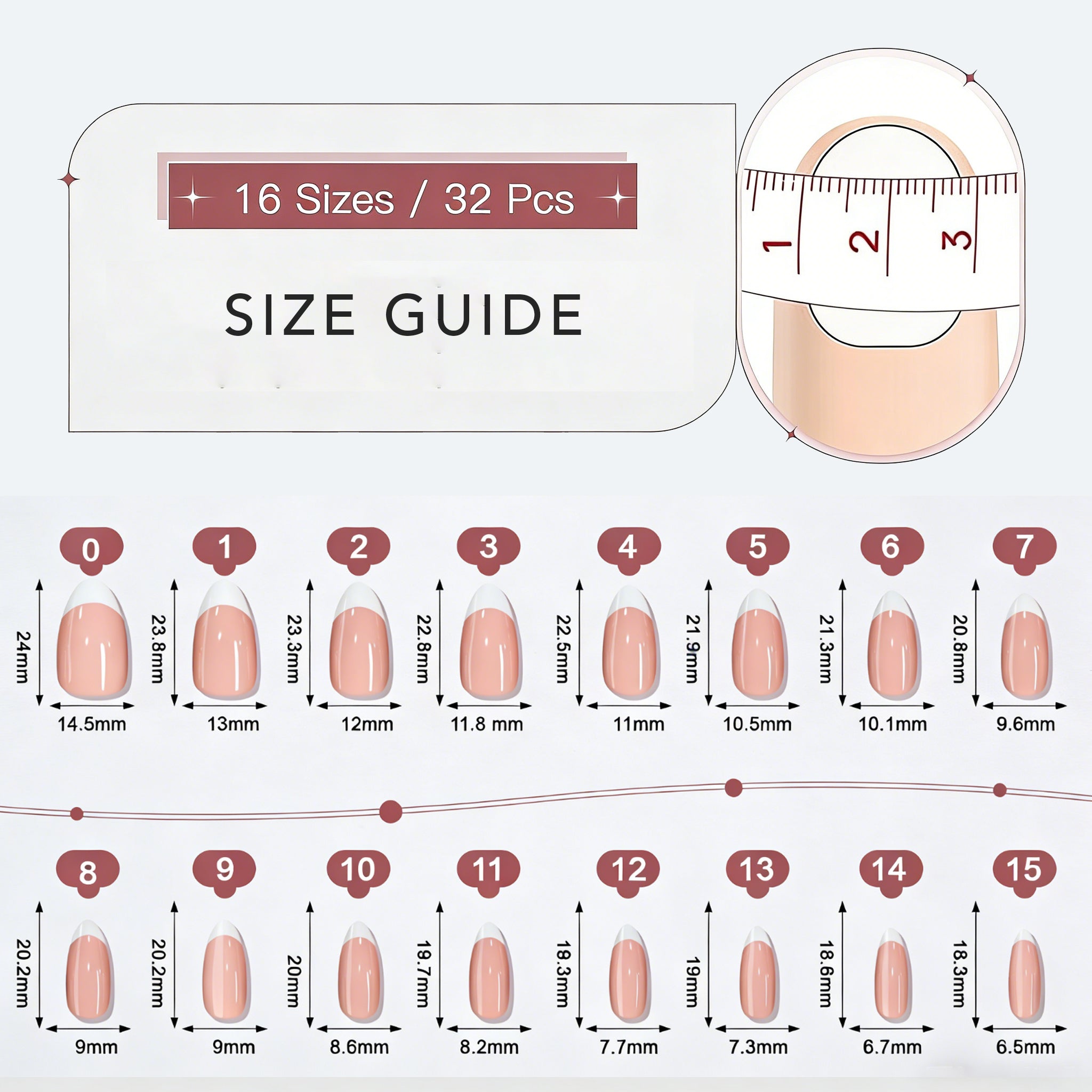With 32 nails in 16 sizes, you’ll always find your perfect fit and achieve flawless nails in just 5 minutes.