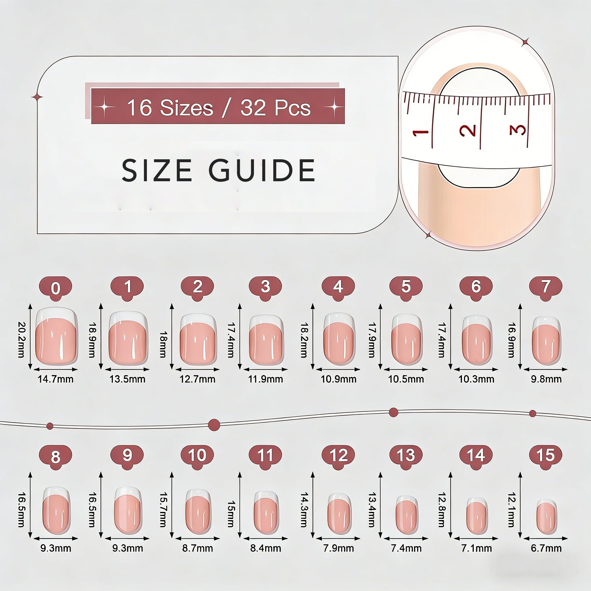 With 32 nails in 16 sizes, you’ll always find your perfect fit and achieve flawless nails in just 5 minutes.